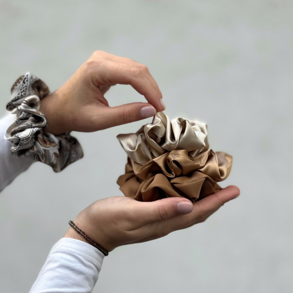 Sada 4 ks velkých saténových gumiček - Orient, Pekanová matná, Zlatá, Champagne