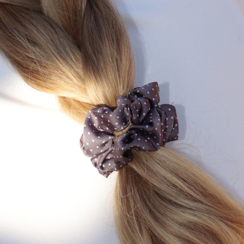 Úzká saténová scrunchie gumička - Hnědý puntík